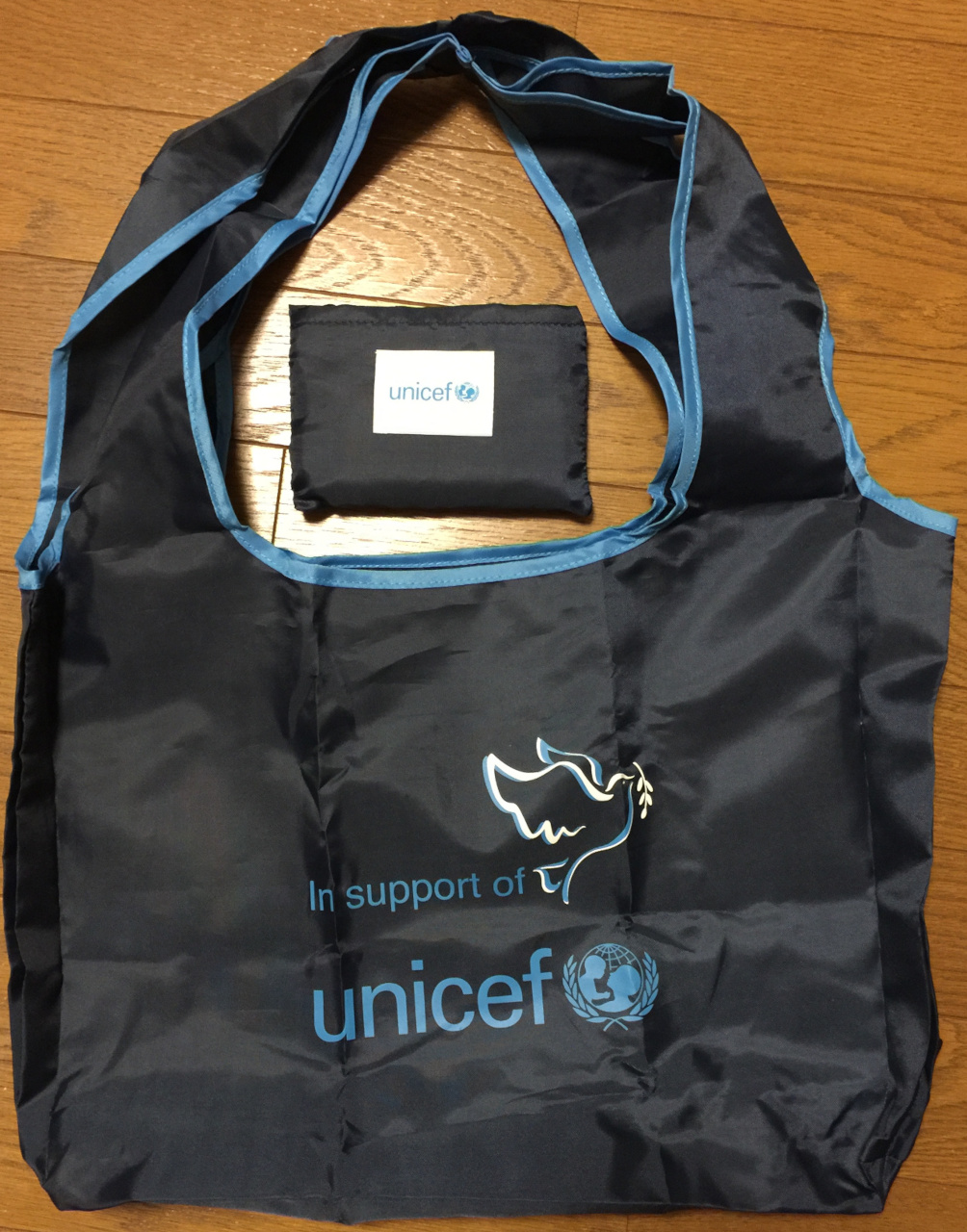 まずは子どもたちを守る活動を行う国際連合の一機関UNICEFのものです。持ち手の輪の中にあるパスポートくらいのサイズのものが内ポケットに畳んで収納された状態で、それを広げると大きくなります。